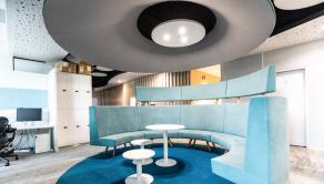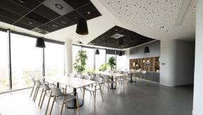 Prostory, jež lze flexibilně upravit, jsou aktuálně dispozičně řešené v kombinaci open space, uzavřených kanceláří, zasedacích místností, relaxačních zón, akustických telefonních boxů zajišťující maximální soukromí i vlastního nahrávacího studia pro 230 zaměstnanců. Akustické stěny i stropy zajišťují dostatečný klid pro pracovní činnost.
